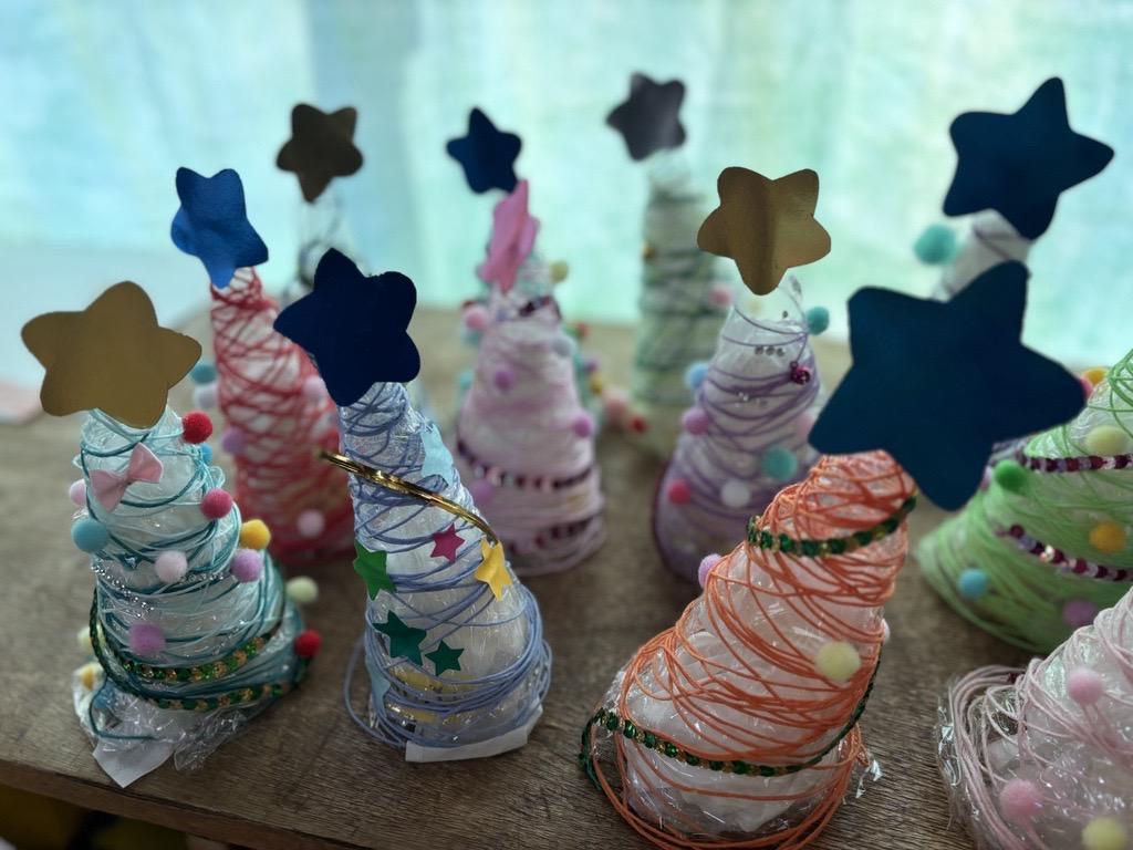 ゆり組さんは、サランラップと糸をメインにクリスマスツリーを製作しました🎄✨