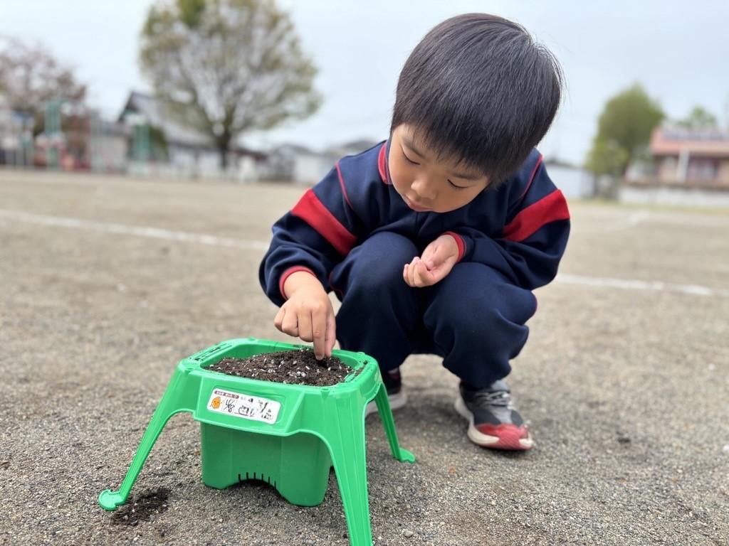 今日のゆり組(年長クラス)は、アサガオの種を植えていました