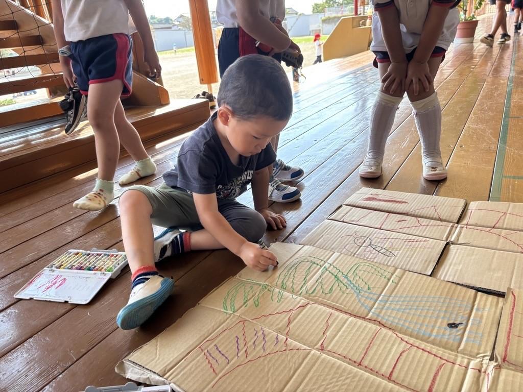 恐竜の世界を3本のクレヨンで表現するおともだちや、毎日乗っている幼稚園バスを描こうと挑戦するおともだちもいました!!お互いの絵を見ながら一緒に遊びを広げていく中で、思うように描けず教師に『メロンバスが描けないんだよ💦お願い!描いて!!』と頼む姿もあり、子どもたちの自由な発想と表現の豊かさや意欲と工夫、そしておともだちと一緒に作り上げていく楽しさが感じられるひとときとなりました☺