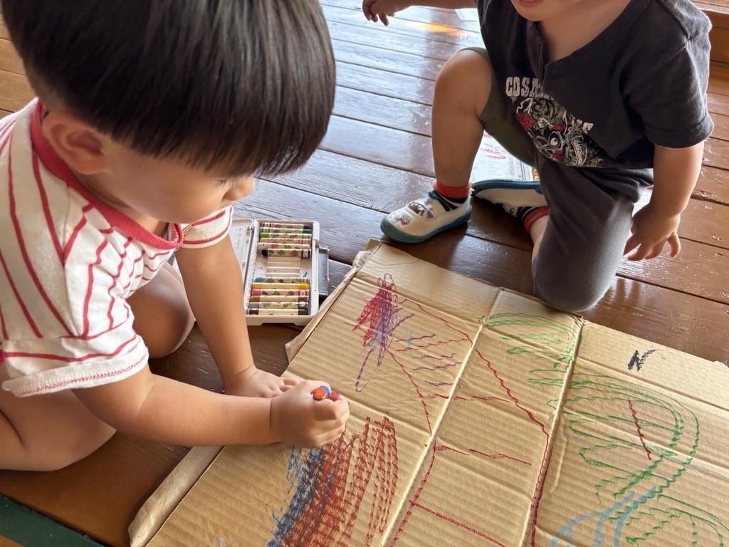 つぼみ組(2歳児クラス)のおともだちが、テラスで電車を走らせている姿をきっかけに、教師が段ボールにクレヨンで線路を描いてみると、電車はどんどん長い道を走り始めました🚃✨