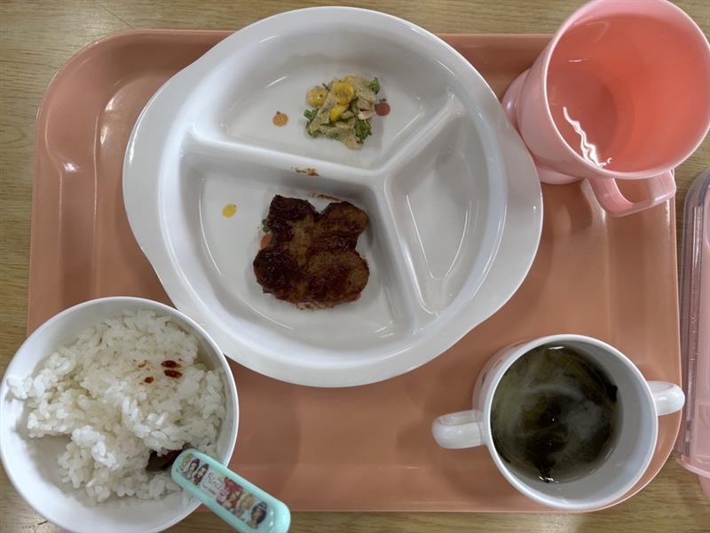 給食のメニューは”ごはん🍚・みそ汁・ハンバーグ・ブロッコリーサラダ”