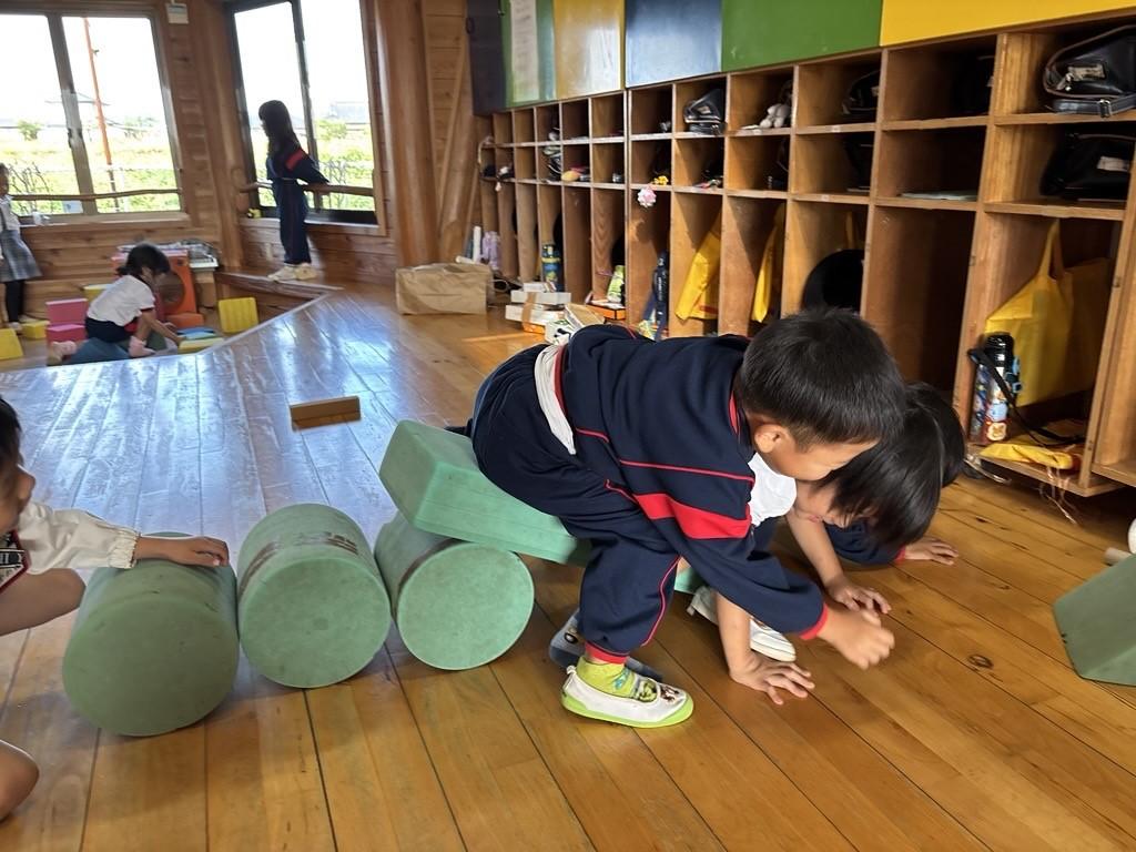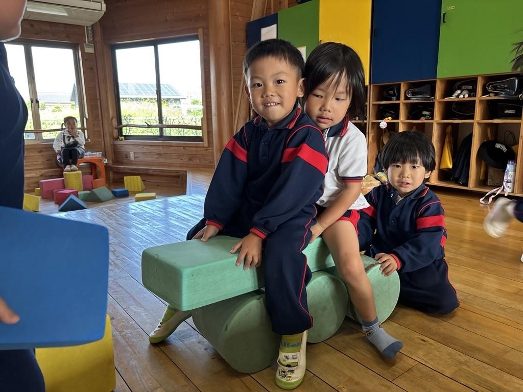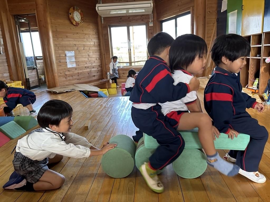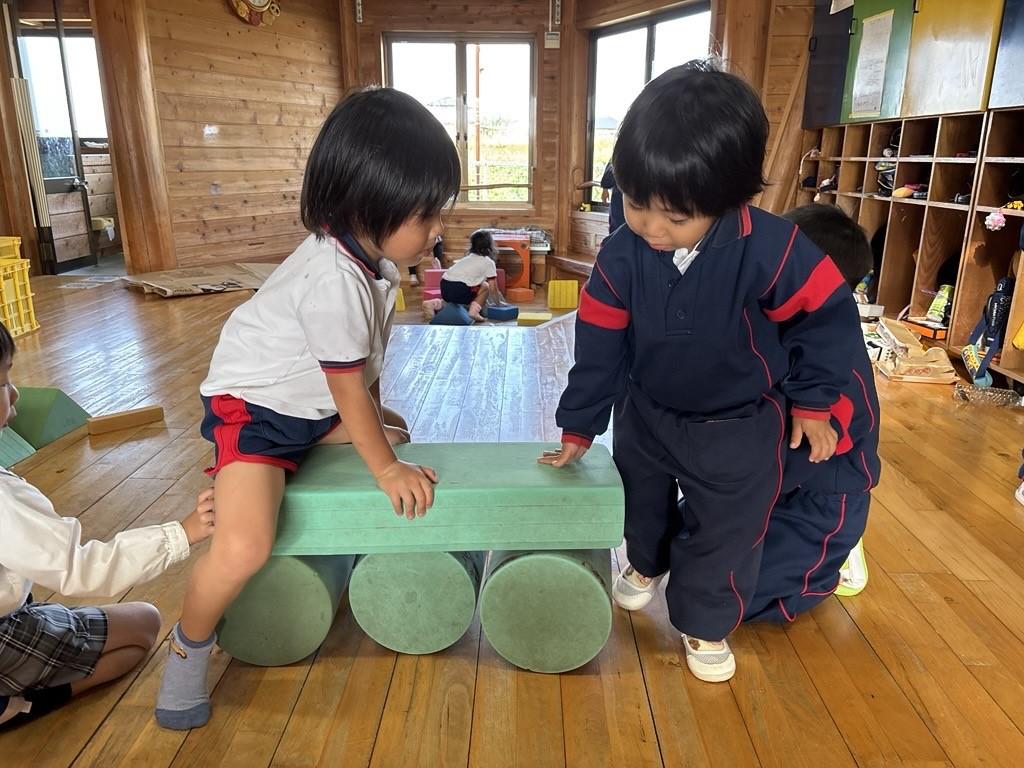 その発見に目を輝かせ、円柱のブロックを増やしてみたり、おともだちと一緒に乗ってみたりと、遊びはどんどん広がっていきます♪