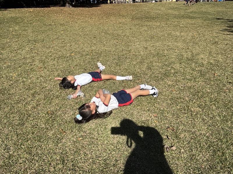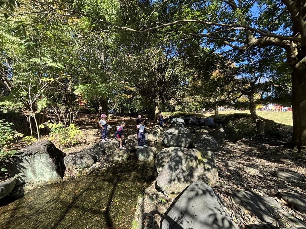 遊びの途中では、『疲れた~💦』と言って芝生に寝転ぶおともだちもいれば、大きな枝を見つけて上下に揺らし、風を起こすように楽しむおともだち、石の上を通って川を何度も横断するおともだちや、葉っぱを集めて焚火のように楽しむおともだちもいました★