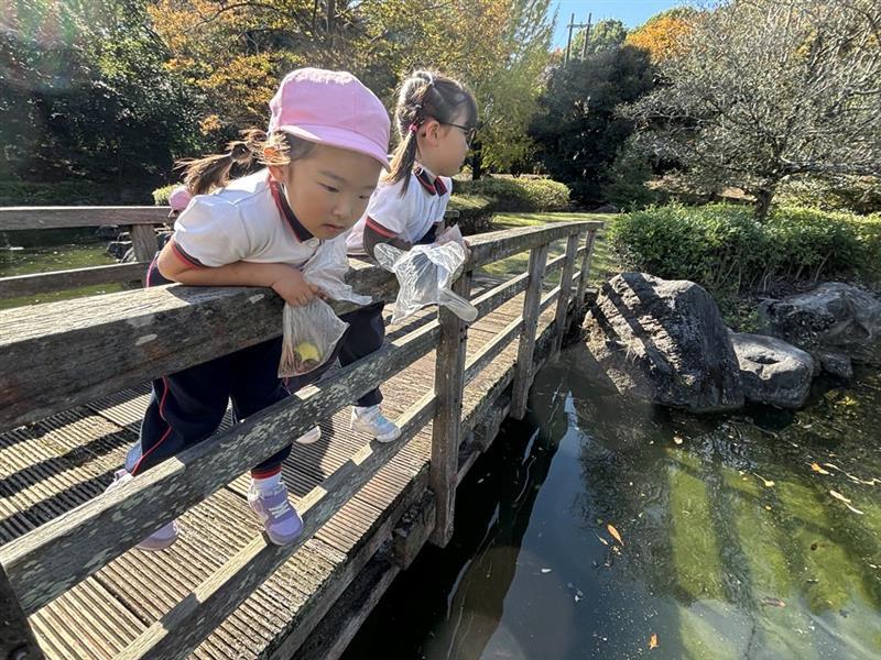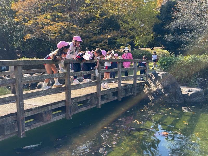 池の周りでは、のんびり泳ぐ鯉やカモを見つけて大喜び🦆❤