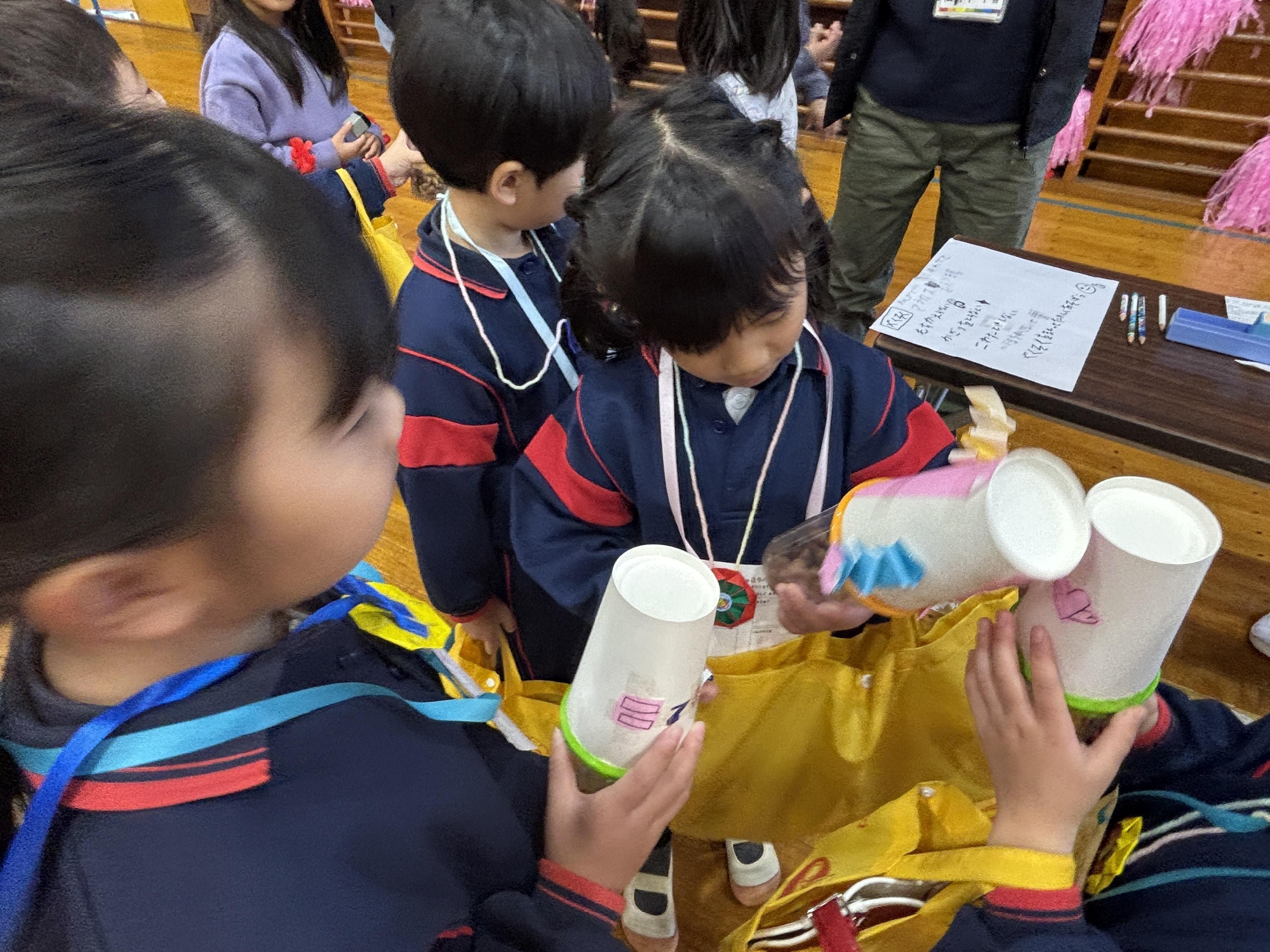 うまく紙コップの中にキャッチできると、『入ったぁ~!!!』と嬉しそうな声が玄関に響きました♪