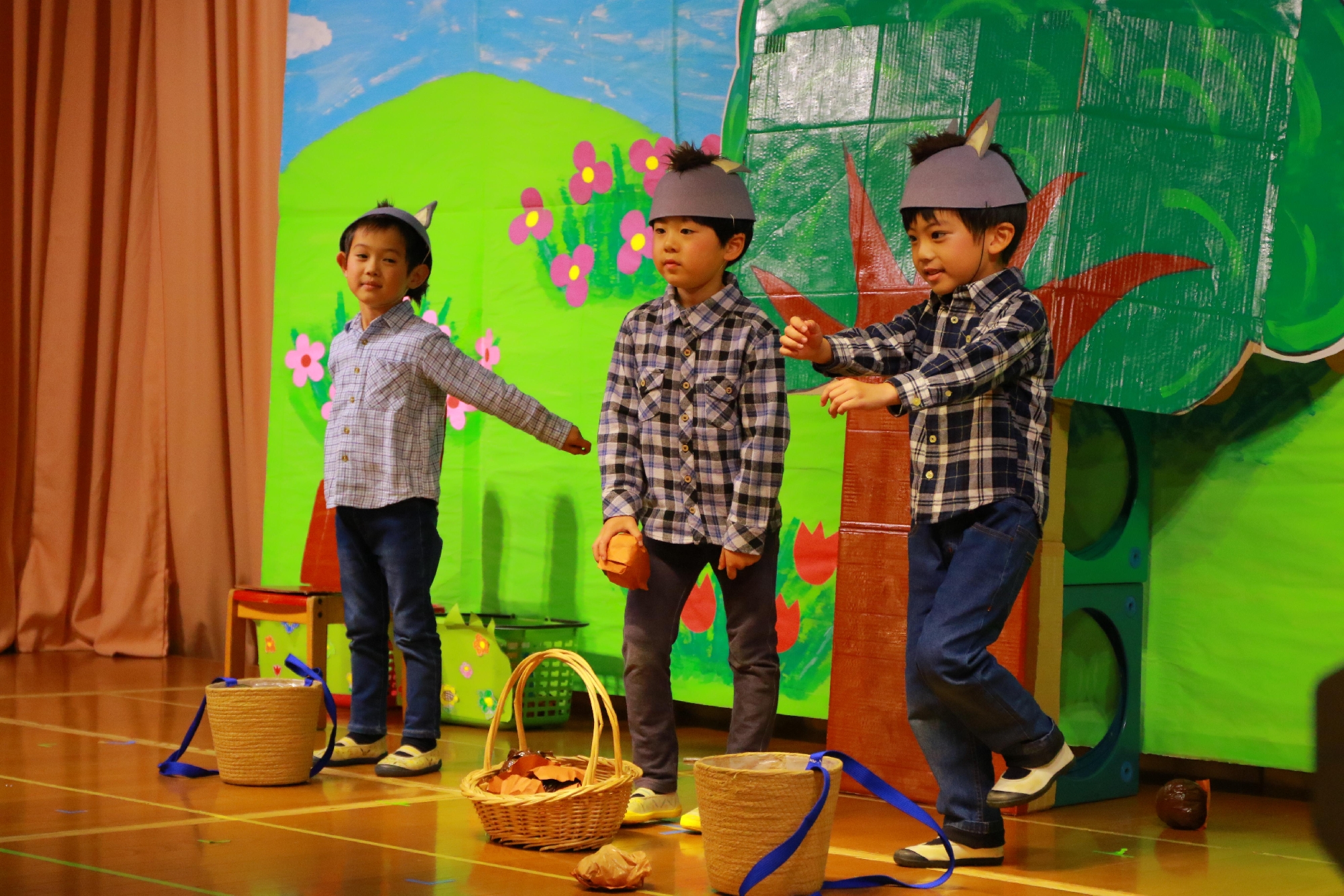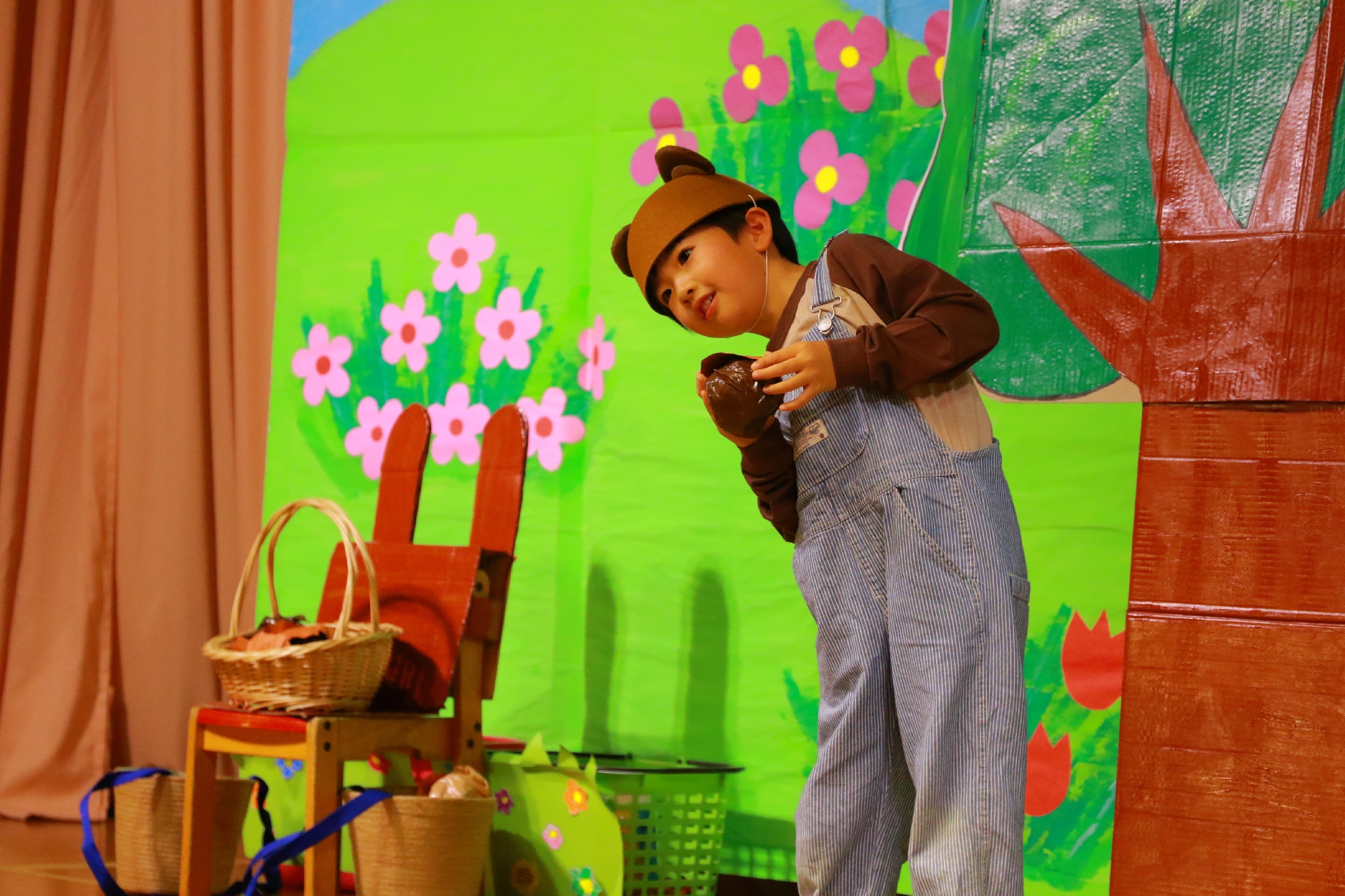 劇中で登場するドングリなどの小道具も、『新聞紙を丸めて色画用紙を巻こう』『下の部分の色を変えたら栗に見えるんじゃない🌰?』などと、おともだちと相談しながら作り上げている姿や、『コレ、フランスパン!!』『ハチミツは黄色だけど、空になったら水色になるの~』と嬉しそうに作ったパンやハチミツを教師に見せる姿がとても印象的でした✨