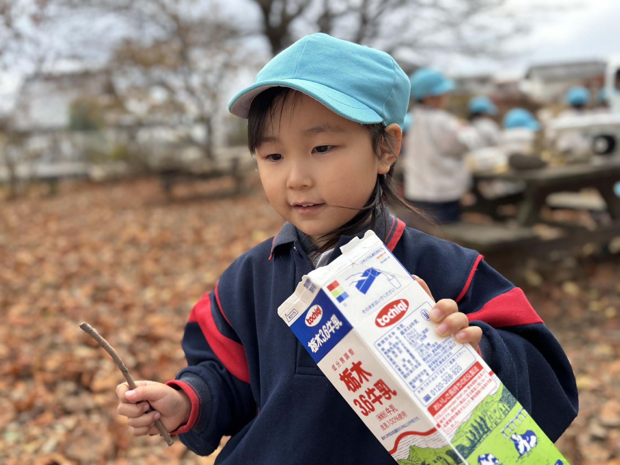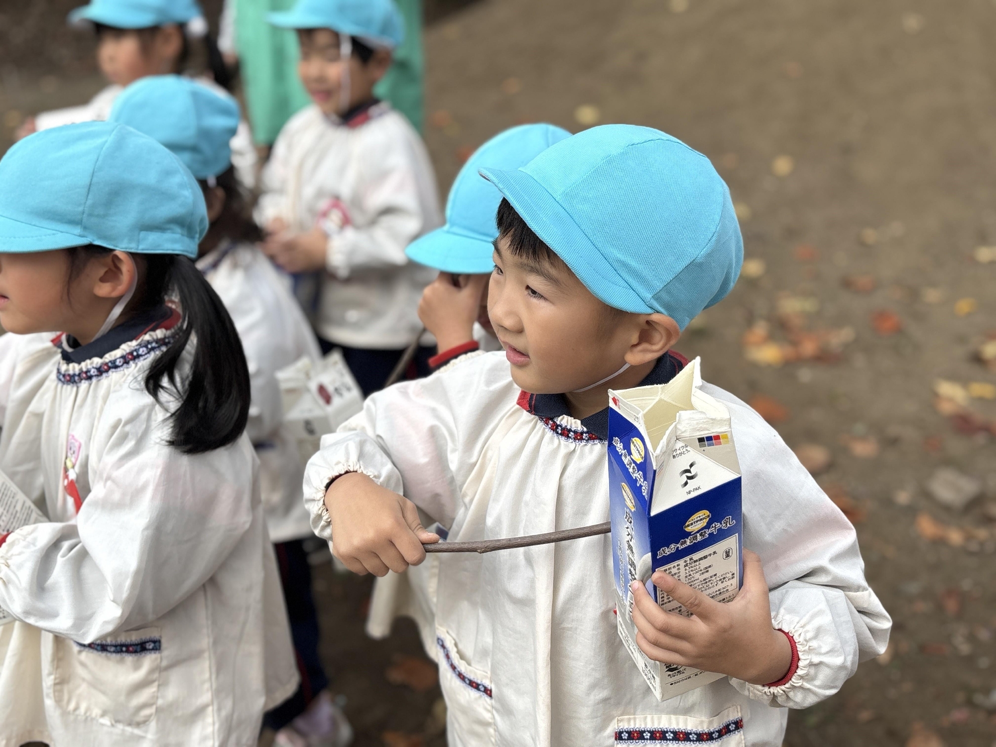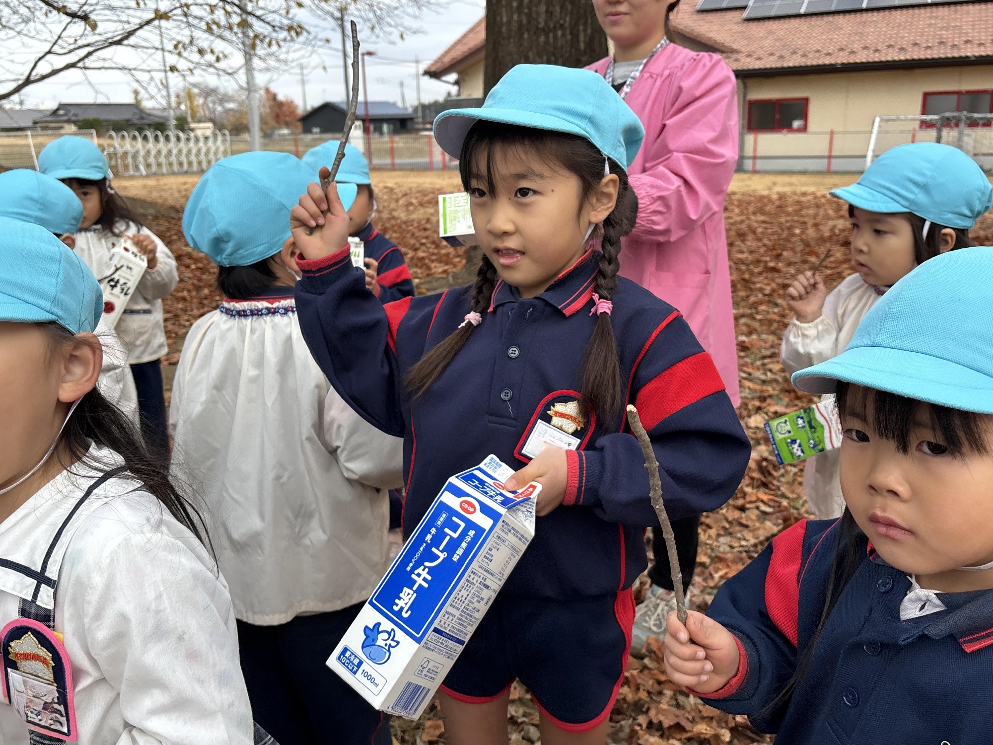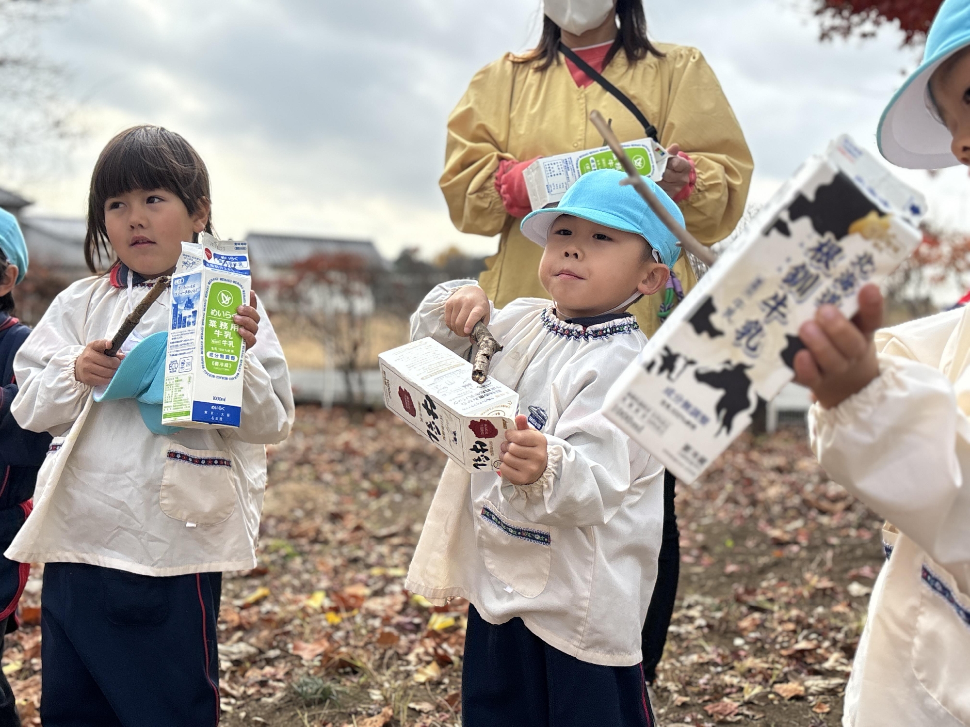 次は空の牛乳パックを枝で軽く叩き、リズムに合わせて「きらきら星」を演奏★