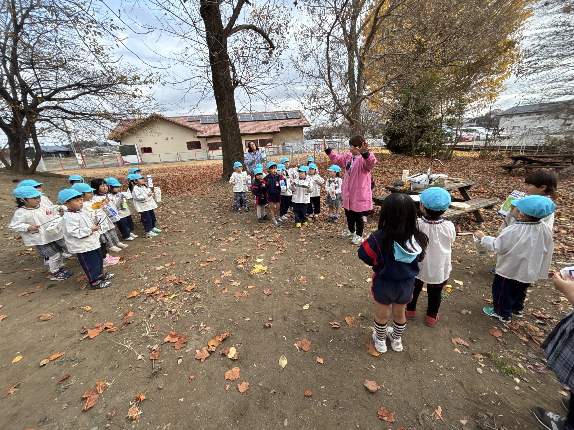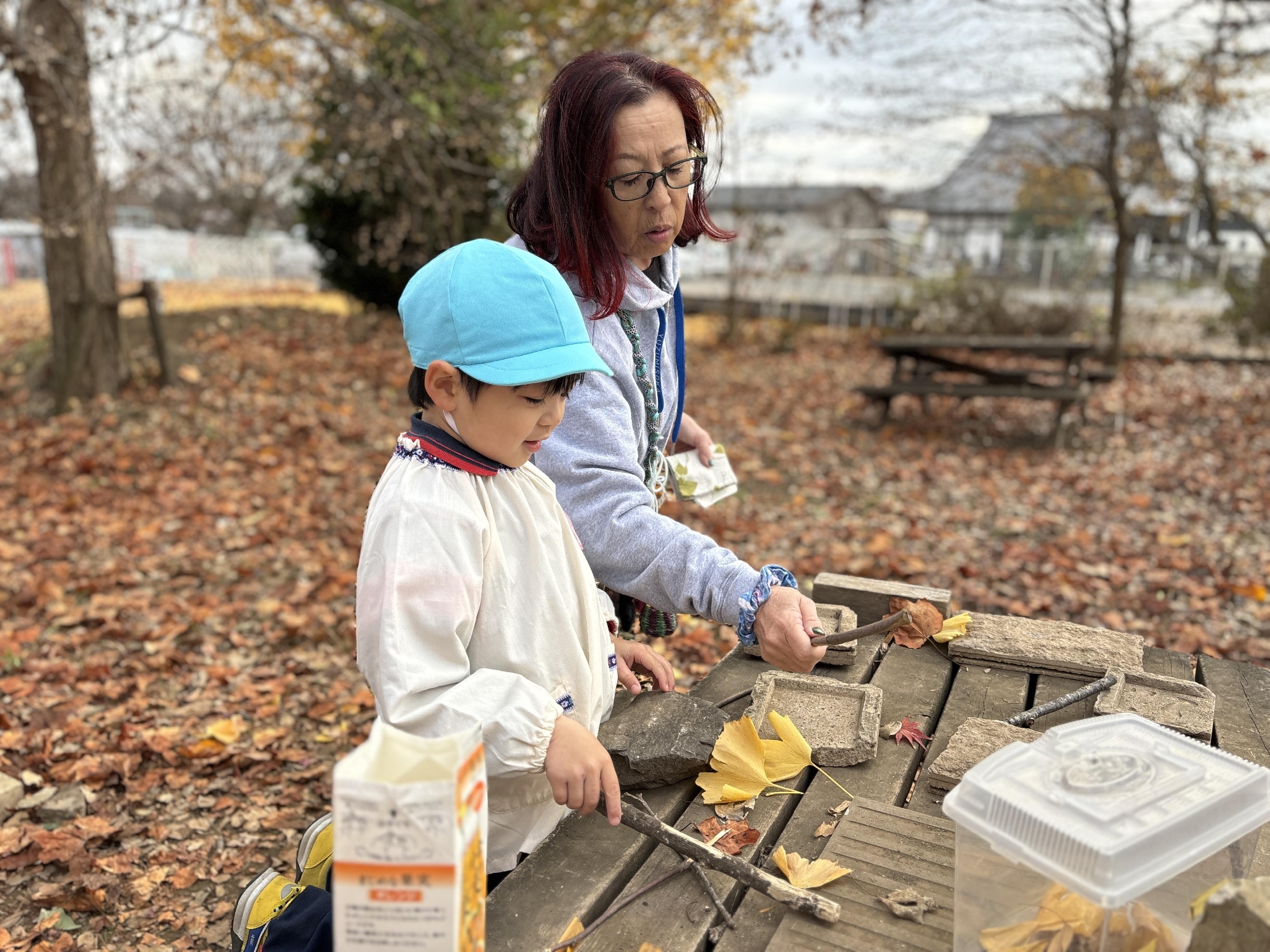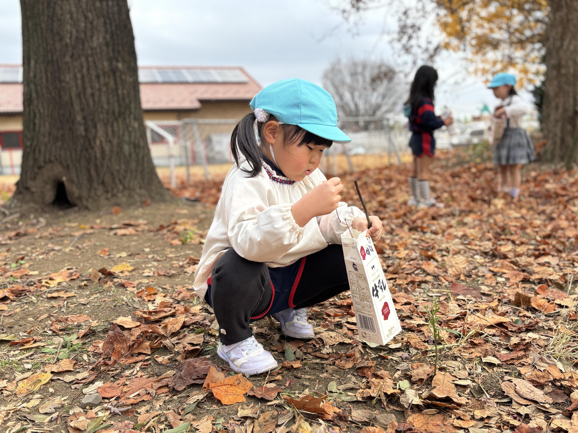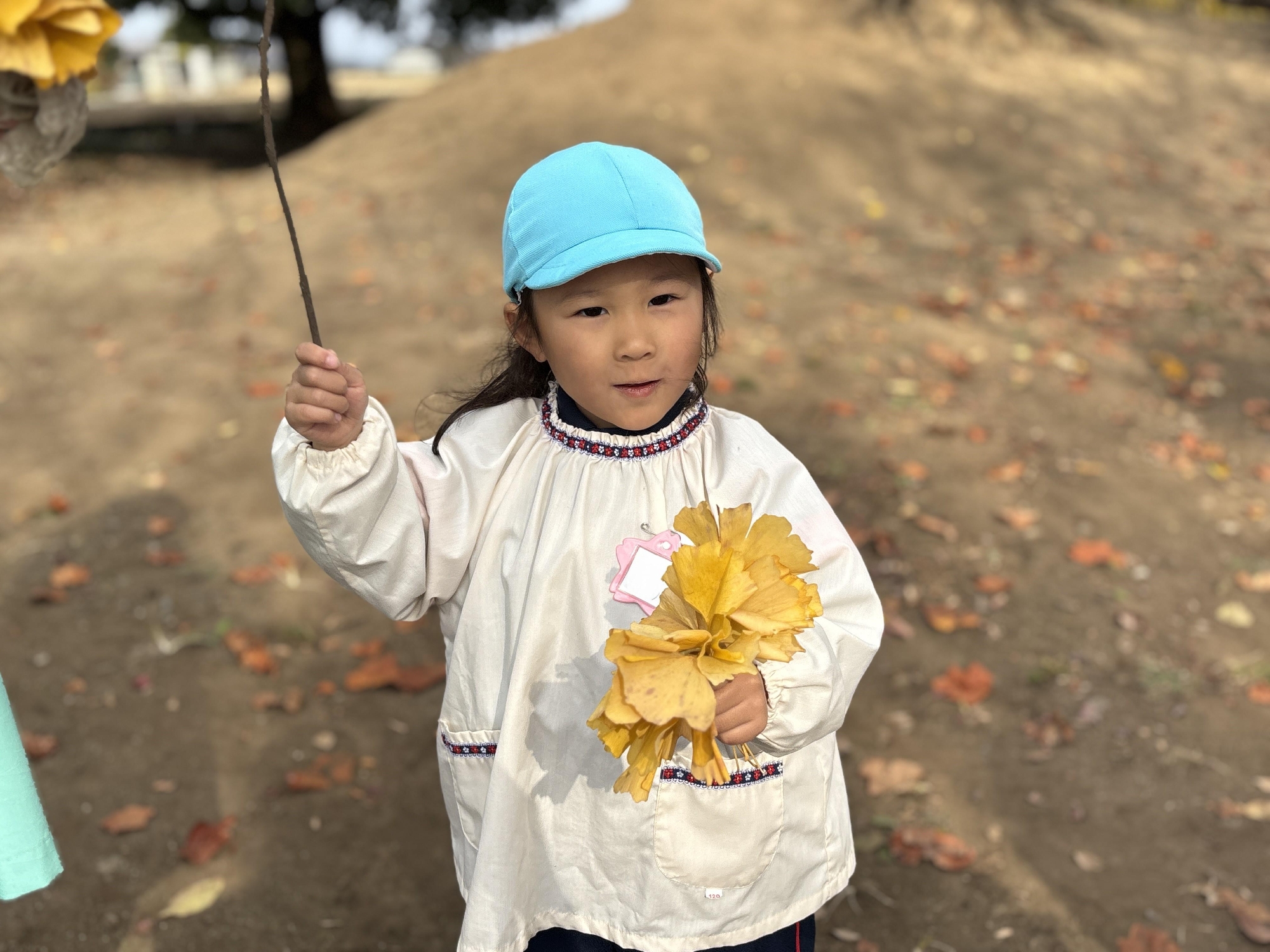 芝生にたくさん落ちていた黄色のいちょうの葉を集め、手のひらいっぱいに掴んで振ってみると、「シャラシャラ」と柔らかく心地よい音が響き、子どもたちは思わずにっこり☺✨