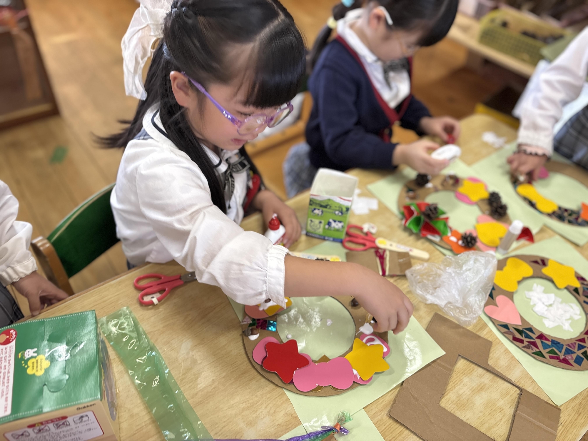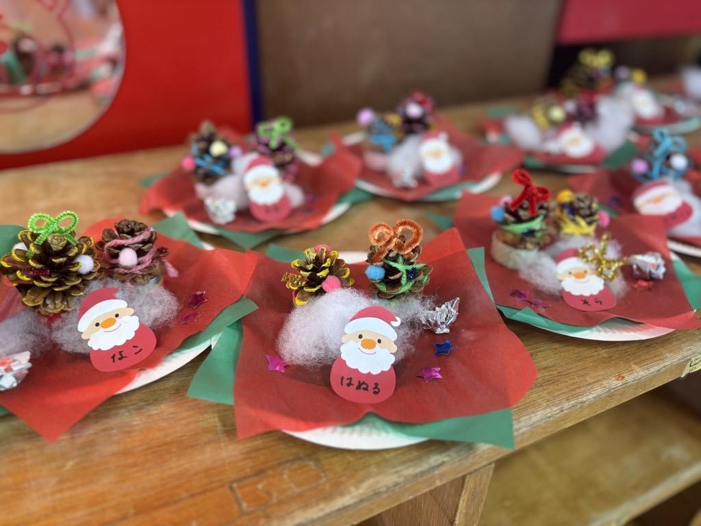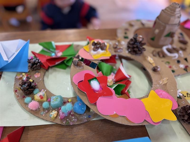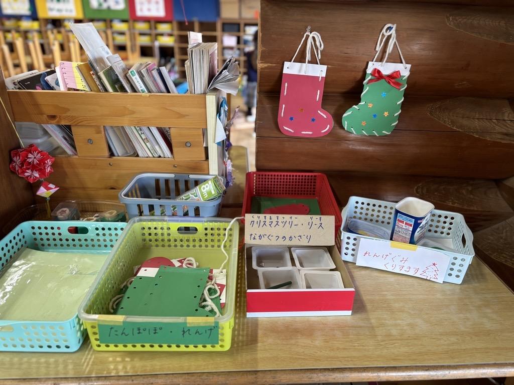 製作コーナーで行われているクリスマス製作では、どんぐりや木の実などの自然素材を使ったリースやツリー作りが引き続き人気ですが、それ以外にもクリスマスを意識した製作がたくさん見られます💛