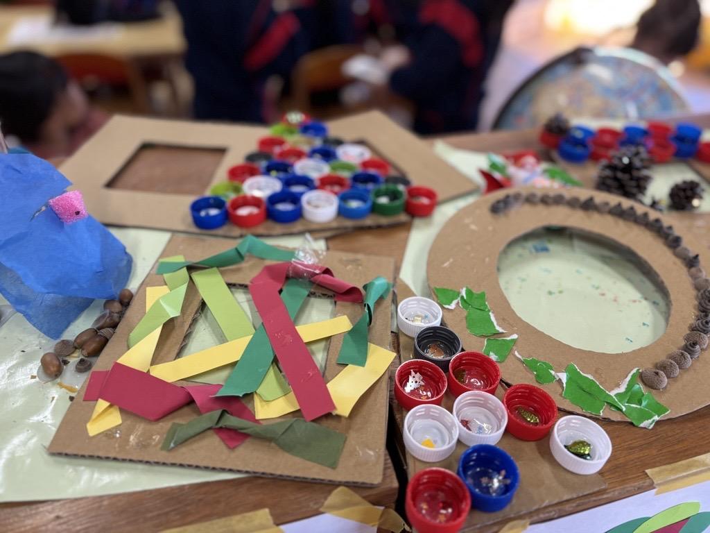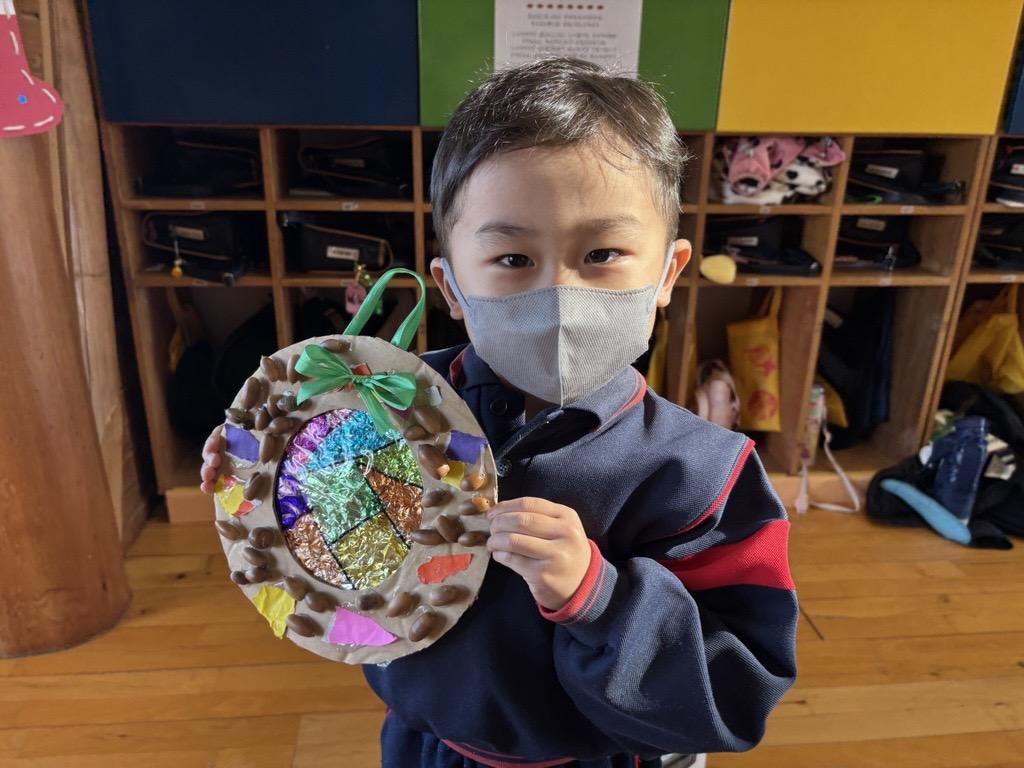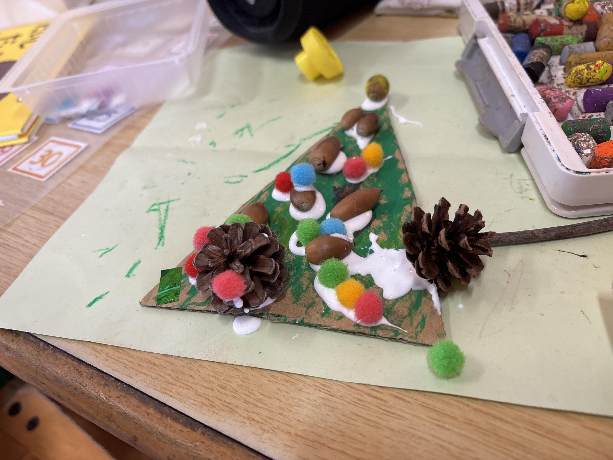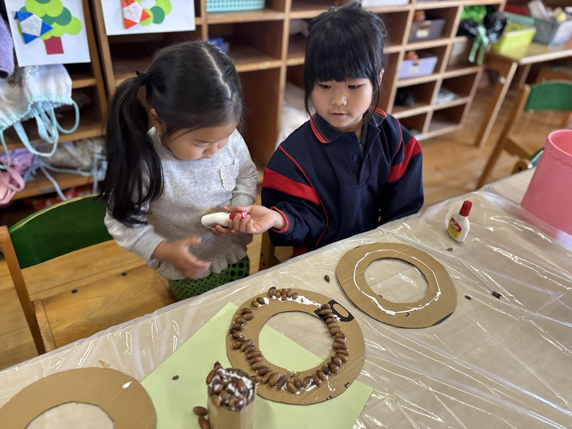 製作コーナーで行われているクリスマス製作では、どんぐりや木の実などの自然素材を使ったリースやツリー作りが引き続き人気ですが、それ以外にもクリスマスを意識した製作がたくさん見られます💛