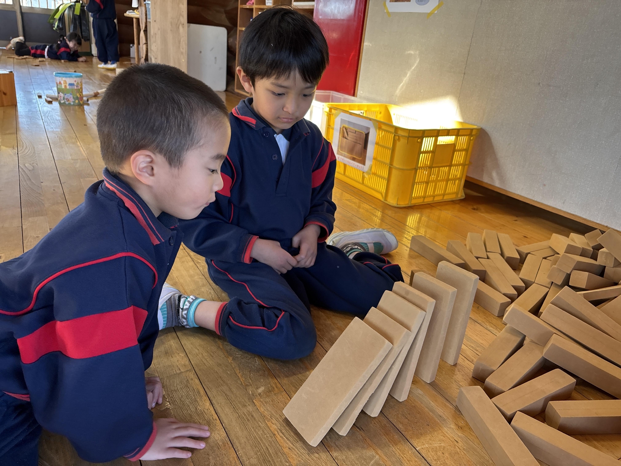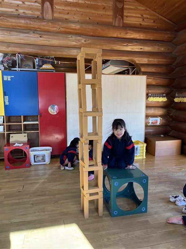 「なんだか壊れやすいねぇ…」と教師がつぶやくと、積み方を見直し、縦に積むだけではなく、横向きにして安定させる工夫を思いつきました💡