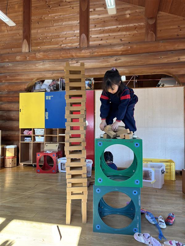 ある日、高く積み上げようと何度も挑戦しているおともだちがいましたが、積み木はそのたびに崩れてしまいます💦