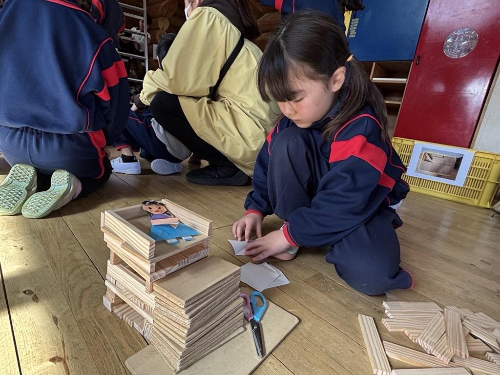 積み木でおうち作りを楽しんでいる子どもたちは、積み木や折り紙で作った人や動物を使っておままごとを楽しんでいます★