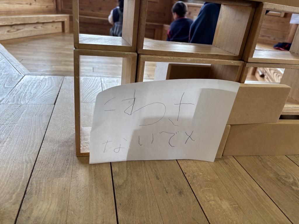 周りを見渡すと、近くにはゆり組(年長クラス)が大切に作っている作品があり、そこには”こわさないでね”と書かれた張り紙が貼ってあります♪