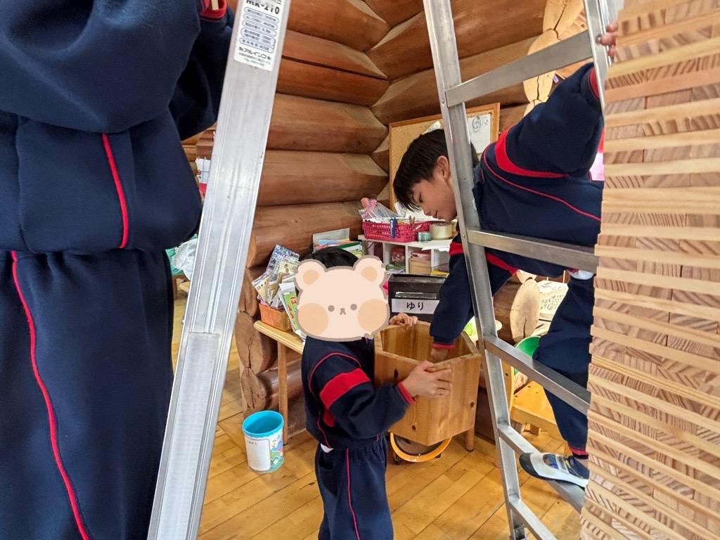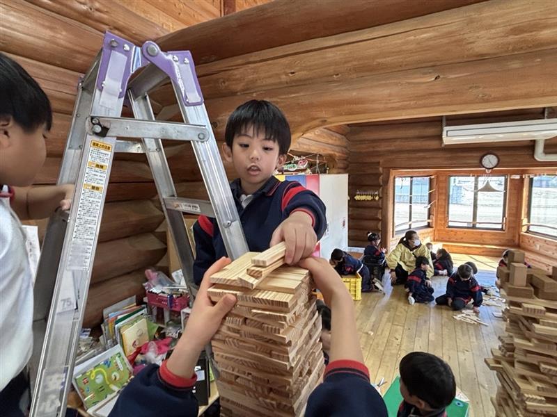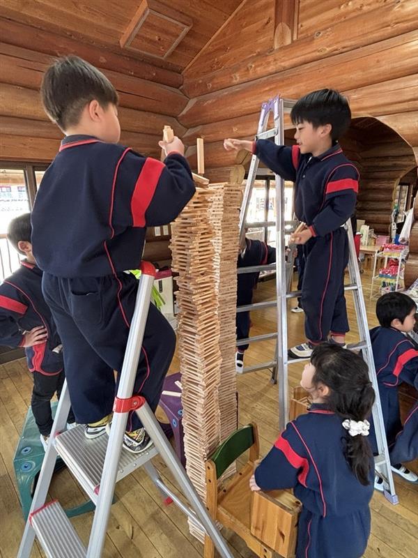 「もっと高い所に積みたい!」という思いが強くなり、なんと教師に梯子をお願いする姿がありました☺