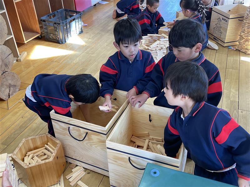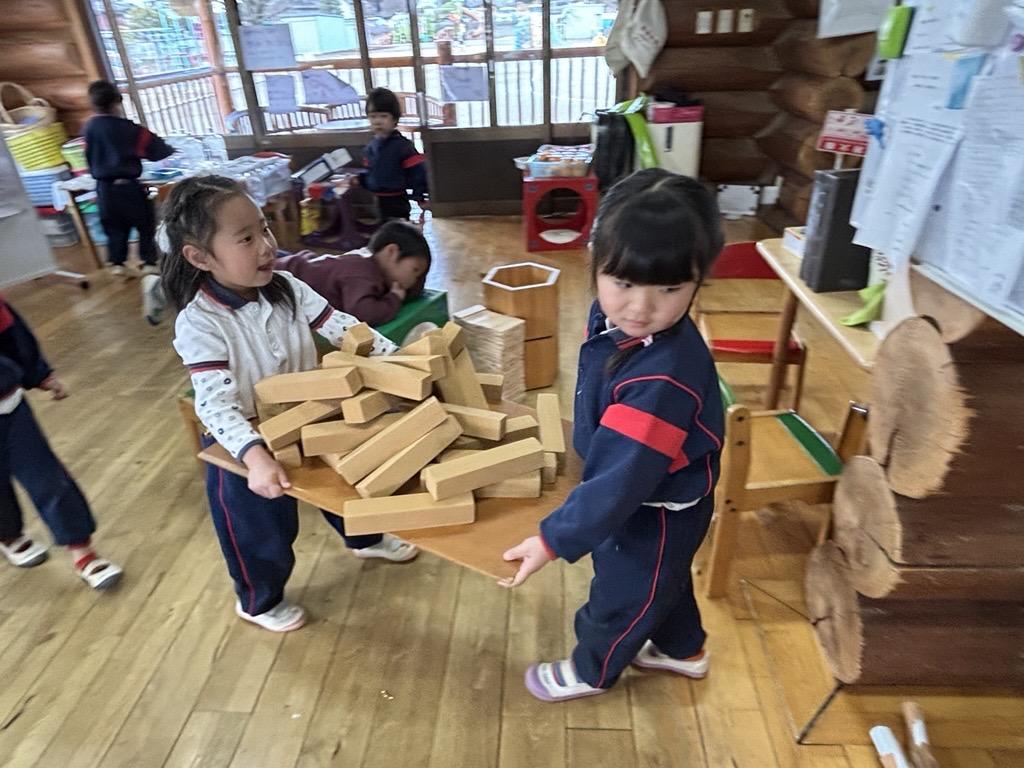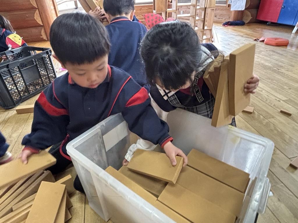 箱の写真をよく見比べ、向きや重ね方を確認しながら丁寧に片付ける姿、おともだちと協力してたくさんの積み木を運ぶ姿は、積み木のあそびの延長として大切な時間です♪