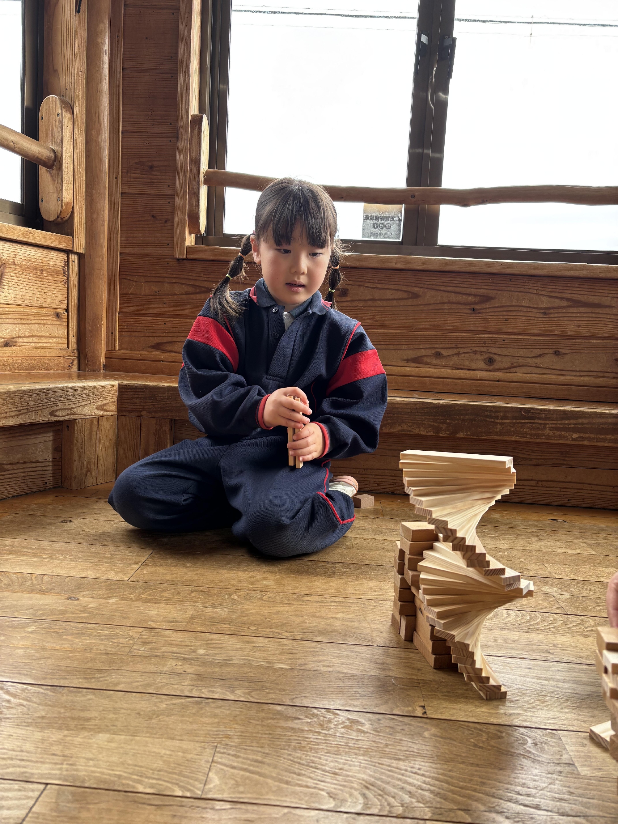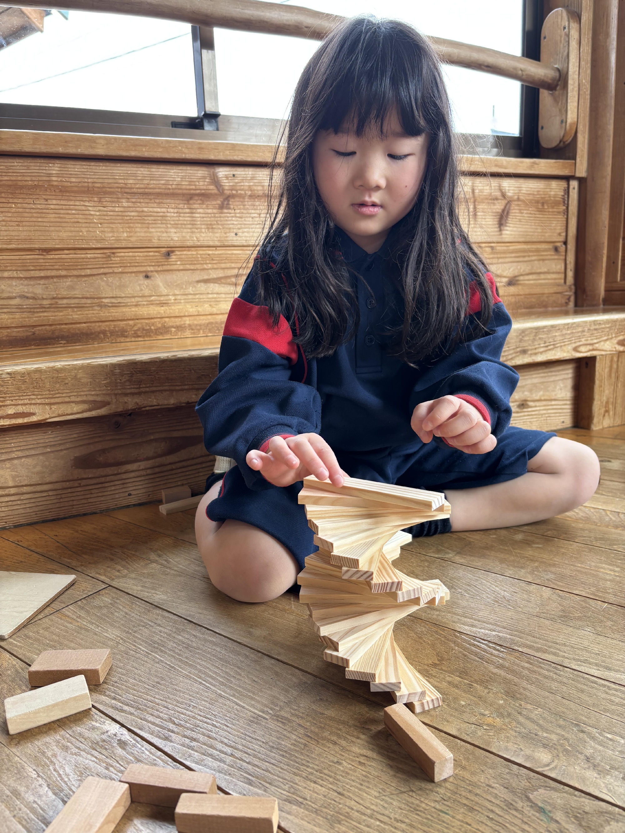 実際に作っているところを見ていただけでしたが、「どうすれば螺旋階段になるのか」をしっかり理解しており、工夫しながら上手に積み上げていきました♪
