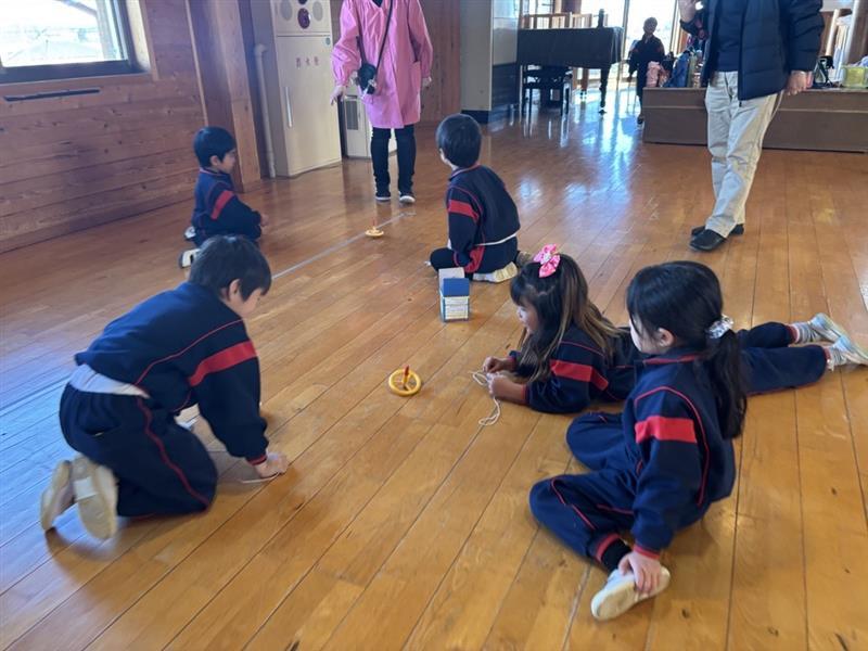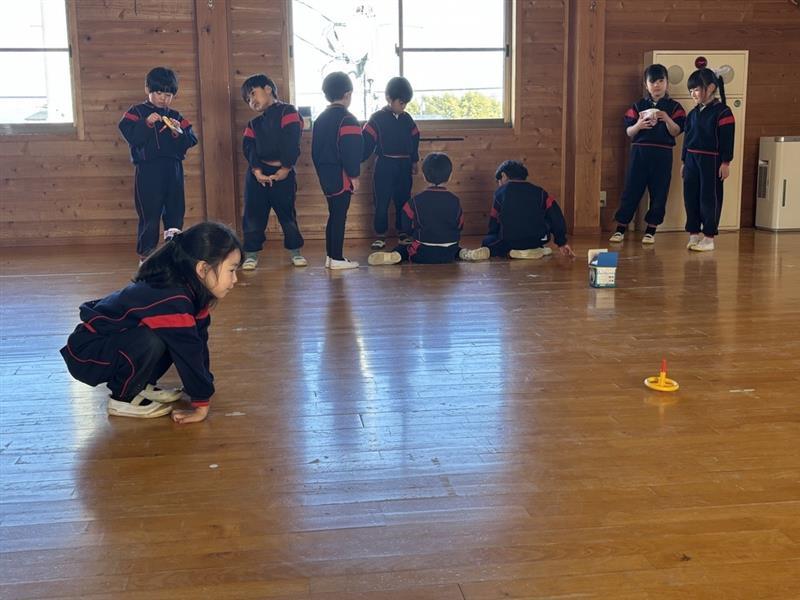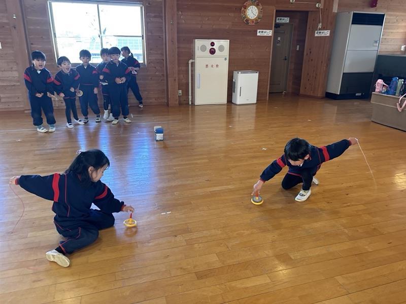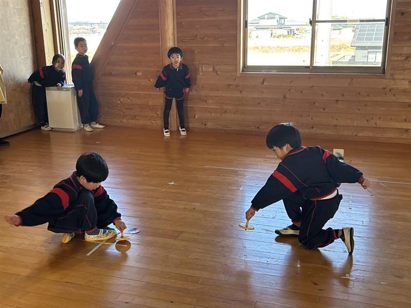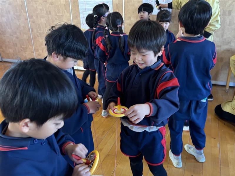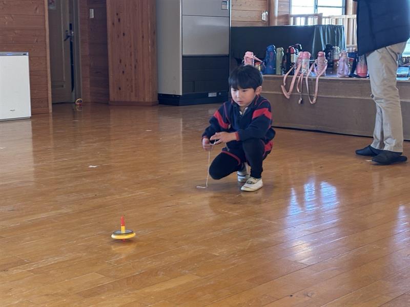 一斉にこまが回り出すと、「おともだちのこまより長く回ってくれ!」と自分のこまに願いをかけながら見つめる子どもたち☺